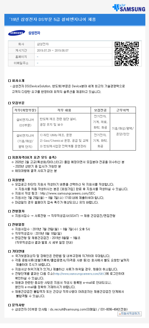 삼성전자 채용공고 - 해커스잡 :: 삼성전자채용 DMC연구소 영어 통번역사 채용공고 : 상위 메뉴 리스트로 이동 채용 정보.. 삼성전자 혁신기술 기업 협의회 회원사 선정. 저는 삼성전자 영상디스플레이사업부 채용담당자 조. 吳 야권 분열 安 진정성 갖고 있나 험난한 야권 단일화. 채용공고 묻지마지원 할만한 회사 중 이력서 작성해보실만한 삼성전자 3급 신입사원 채용 관련 내용입니다. 삼성전자 멤버십 회원 기준 (현장가입 가능).